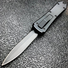 The Mini Black Automatic OTF Knife is quick and tactical with its double action trigger and OTF design. The knife has a razor-sharp 1 7/8”, 440 stainless steel drop-point dagger blade with a black, non-reflective finish. The 3 1/2” handle is black CNC-milled, anodized aluminum, and the trigger switch is conveniently located on top. The 5 1/4” overall OTF knife also features a key-chain loop for a carrying option.